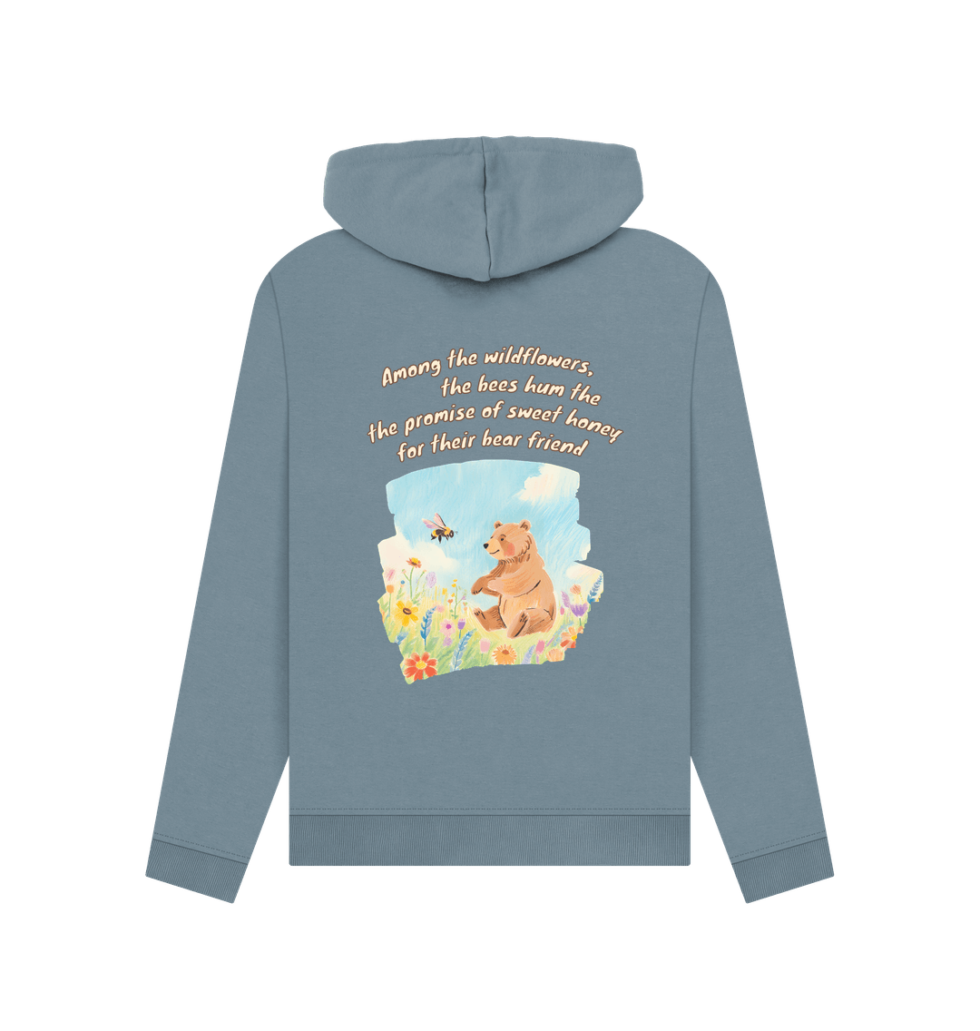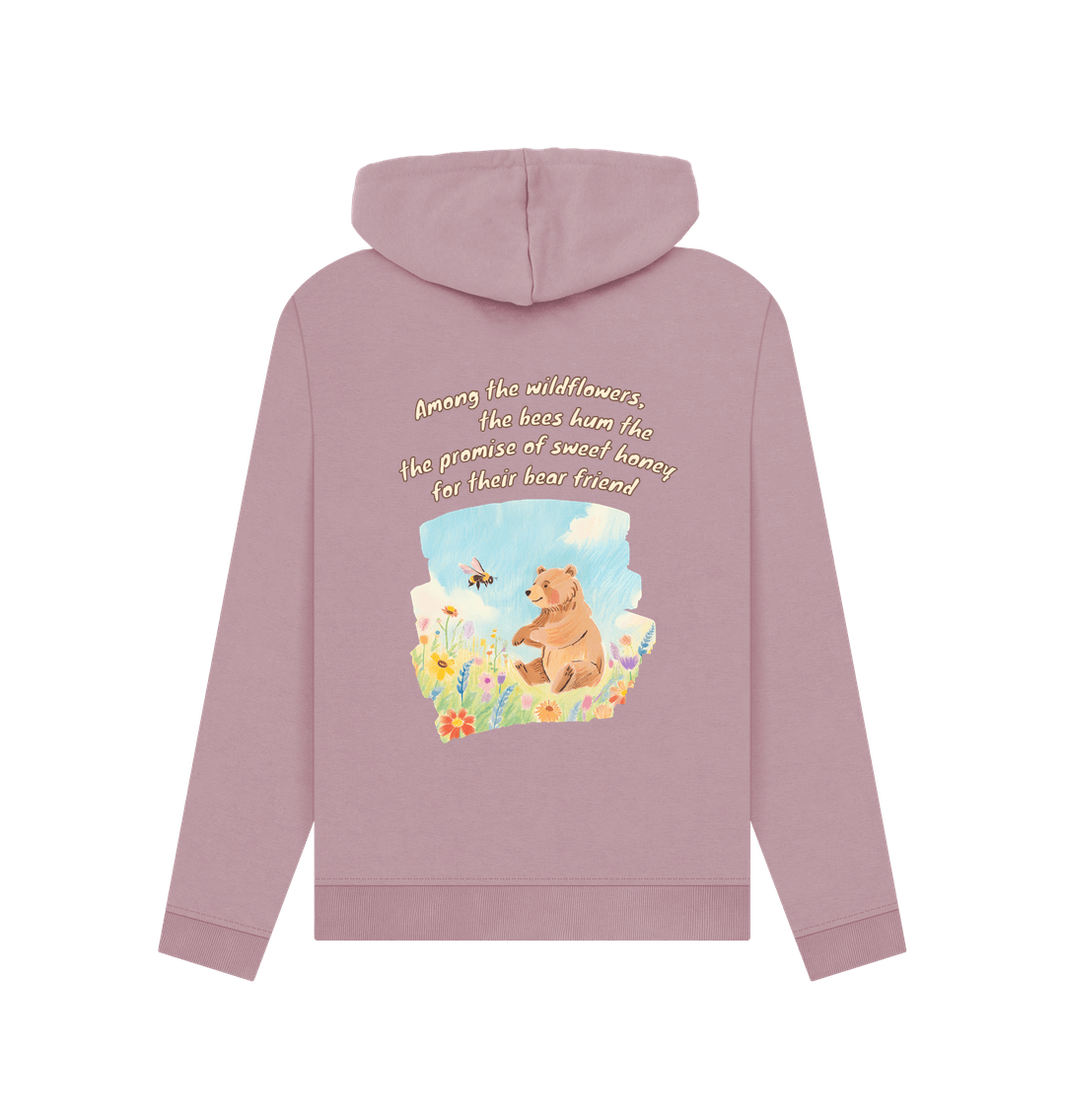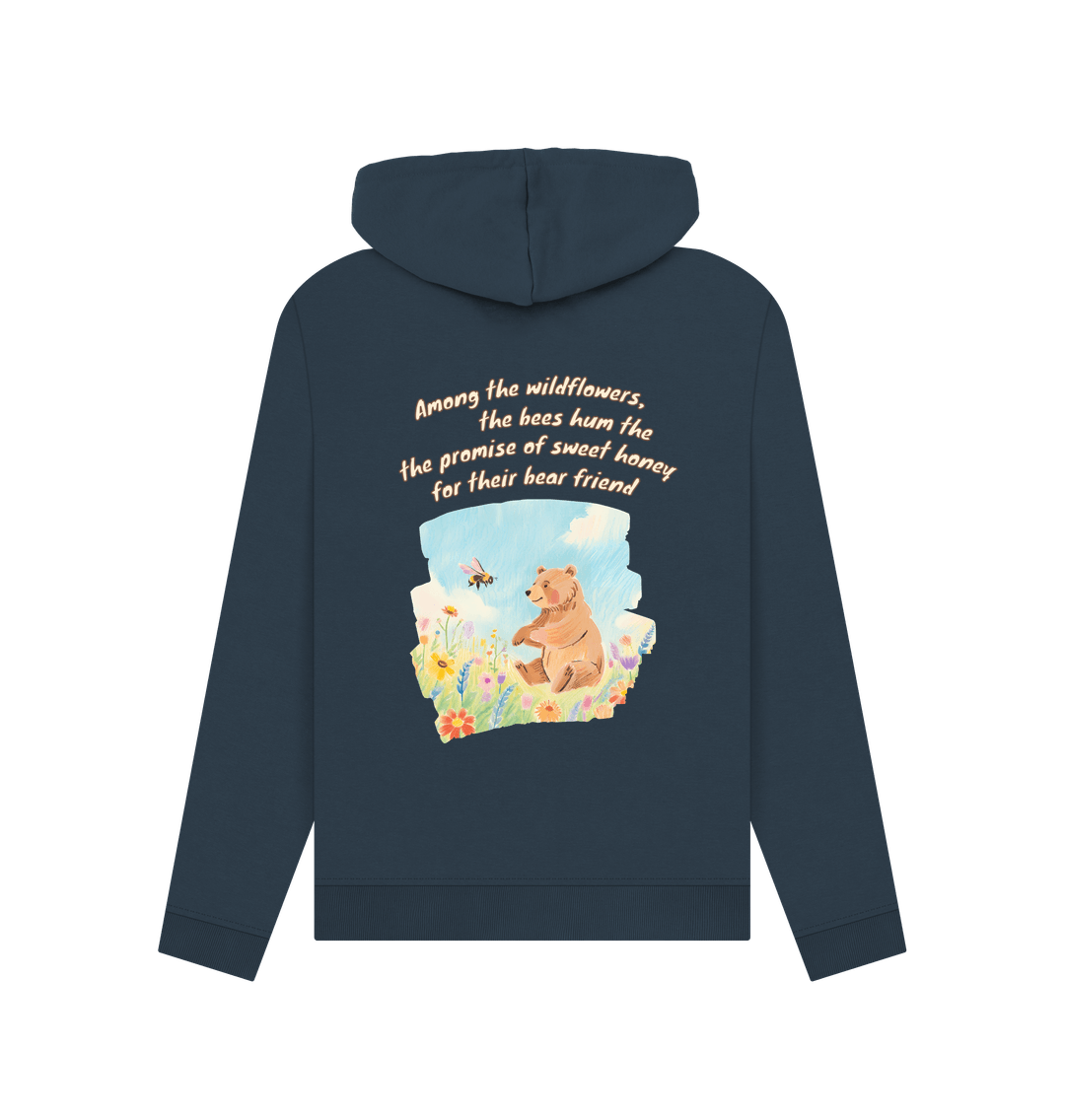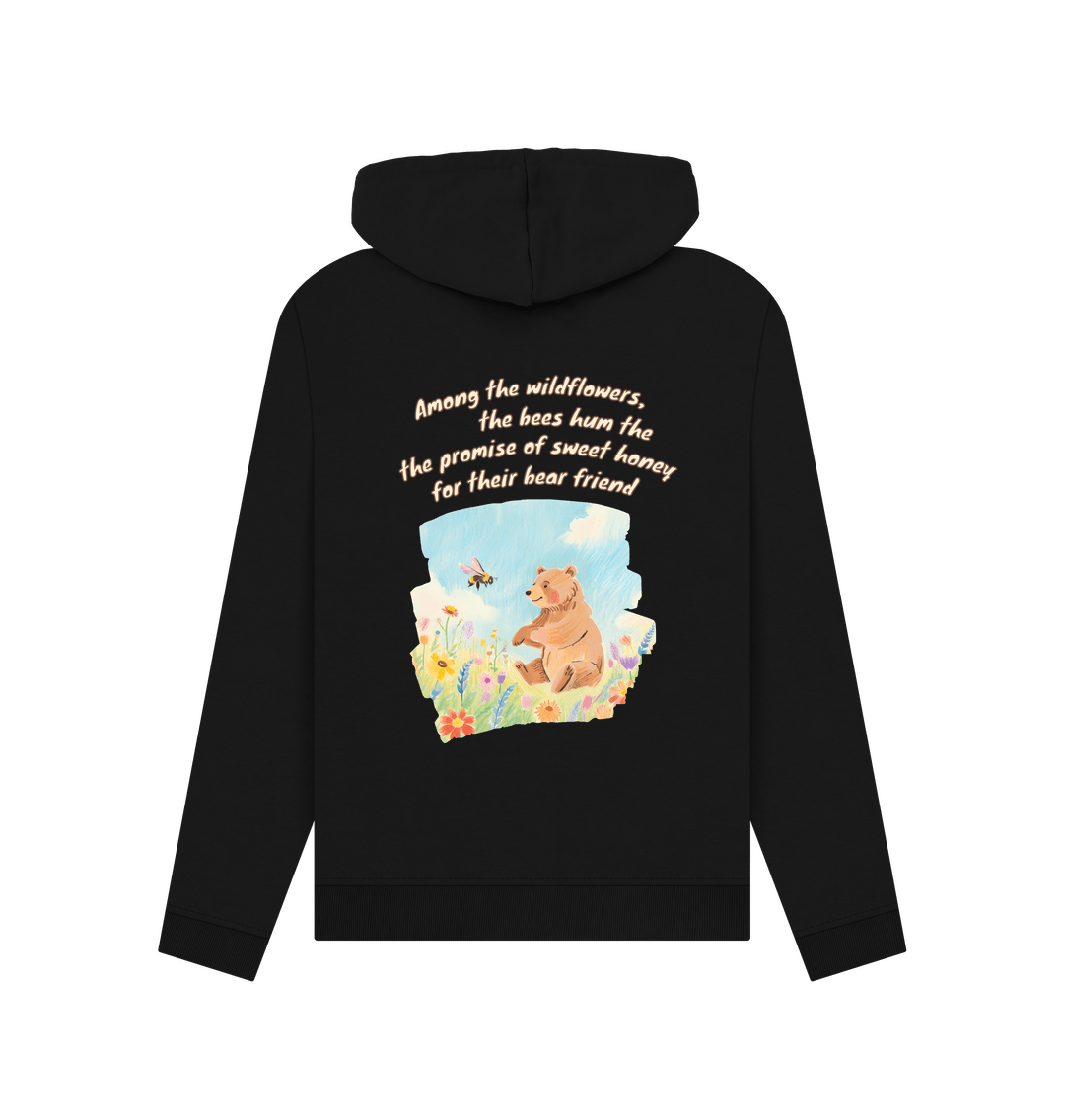Among the wildflowers, the bees hum the promise of sweet honey for their bear friend.