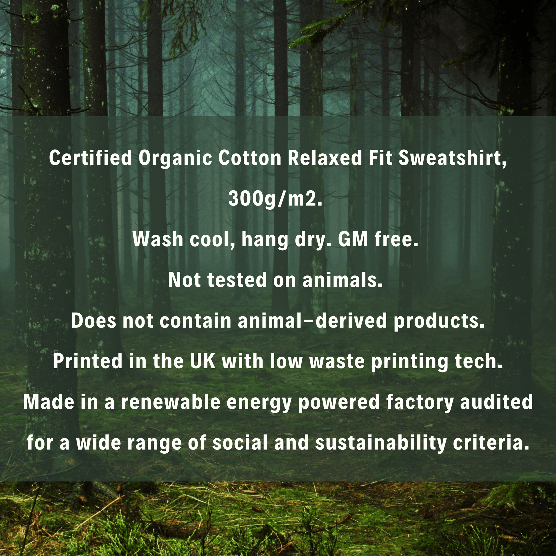 Certified Organic Cotton Relaxed Fit Sweatshirt, 300g/m2. Wash cool, hang dry. GM free. Not tested on animals. Does not contain animal-derived products. Printed in the UK with low waste printing tech. Made in a renewable energy powered factory audited for a wide range of social and sustainability criteria.